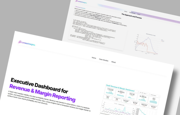 Leadership couldn’t see if the business was actually making money. Revenue sat in one silo, costs in another, and no one had a trusted monthly view of margin. Without clarity, decisions on hiring, pricing, and fundraising risked being guesswork. Lunexa Insights delivered a transparent revenue and margin tracker that surfaced true month-over-month profitability, turning uncertainty into confident, data-backed growth moves.
