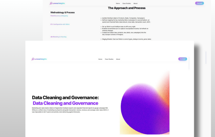 Marketing and sales data lived in silos, HubSpot exports in one corner, financial reports in another. During migration, leadership faced a critical risk: what if records were lost, mismatched, or couldn’t be tied back to revenue? Without reliable alignment, campaign ROI was unknowable, budgets could be wasted, and forecasts missed. Lunexa Insights executed a seamless migration and integration, ensuring every touchpoint, transaction, and dollar flowed into a unified, trusted dataset. The result: leadership could measure ROI with confidence and scale campaigns without fear of broken data.