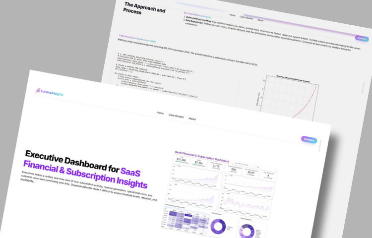 Executives were flying blind. Subscription activity lived in one system, costs in another, and customer value was scattered across spreadsheets. Without a unified, real-time view, leadership couldn’t answer basic questions: Are we profitable this quarter? Are we retaining customers? Is growth sustainable? Decisions were slowed, and financial risk mounted until Lunexa Insights built a centralized dashboard that brought clarity in minutes, not months.