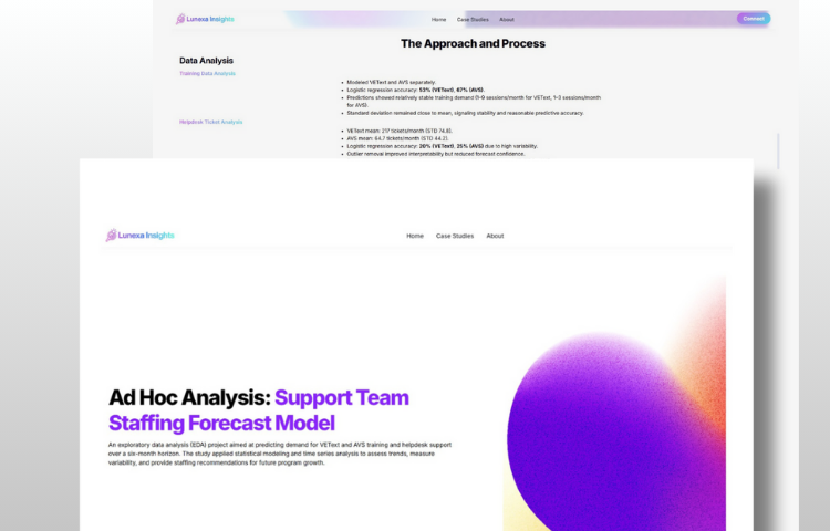 Critical support programs risked being overwhelmed. Leadership had no way to anticipate training or helpdesk demand during program migrations or unexpected surges. If left unaddressed, service quality — and trust in the programs — would suffer. Lunexa Insights built a demand-forecasting model from historical data that allowed leaders to anticipate spikes and staff proactively, protecting service continuity.