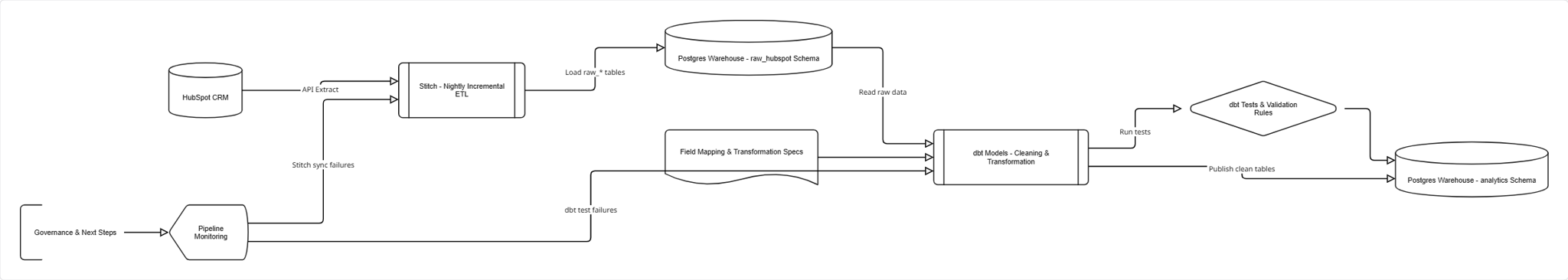 Loaded raw tables (raw_contacts, raw_deals, raw_campaigns) into the raw_hubspot schema in Postgres.