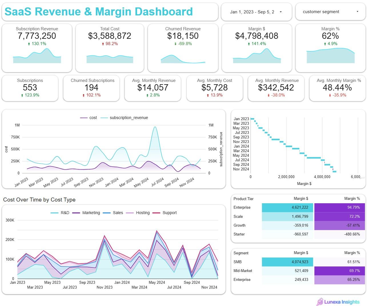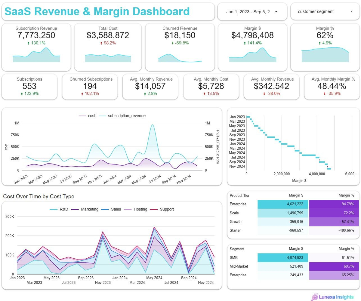 Leadership couldn’t see if the business was actually making money. Revenue sat in one silo, costs in another, and no one had a trusted monthly view of margin. Without clarity, decisions on hiring, pricing, and fundraising risked being guesswork. Lunexa Insights delivered a transparent revenue and margin tracker that surfaced true month-over-month profitability, turning uncertainty into confident, data-backed growth moves.