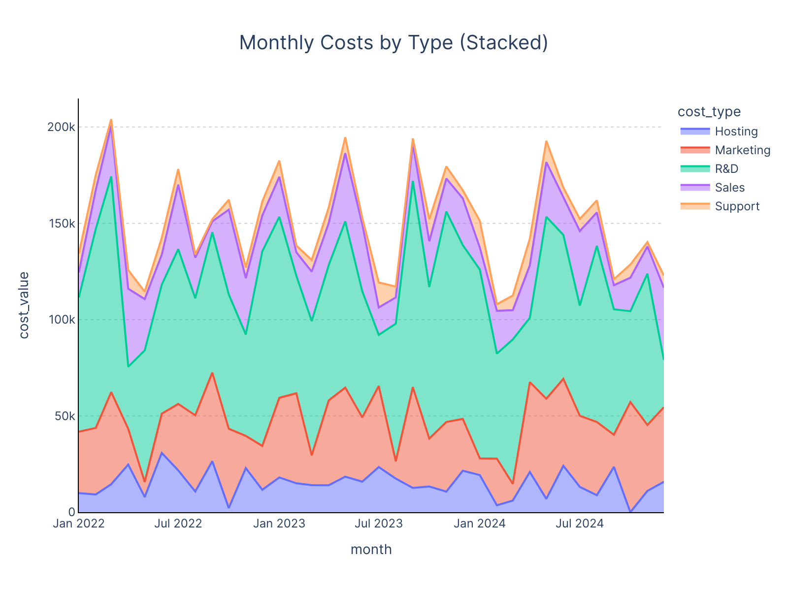 # 4) Cost-type breakdown by month (stacked area)costs_breakdown_long = costs_breakdown_df.sort_values('month')fig_png = px.area(costs_breakdown_long, x='month', y='cost_value', color='cost_type', title='Monthly Costs by Type (Stacked)')fig_png.update_layout( font=dict(family='Inter, Arial, Sans-Serif'), title=dict(font=dict(size=20), x=0.5), plot_bgcolor='white', paper_bgcolor='white', xaxis=dict(showgrid=False, showline=True, linecolor='black'), yaxis=dict(showgrid=True, griddash='dot', gridcolor='lightgray', showline=True, linecolor='black'))png_bytes = pio.to_image(fig_png, format='png', width=800, height=600, scale=2)display(Image(png_bytes))print('Rendered stacked area chart: Monthly Costs by Type')