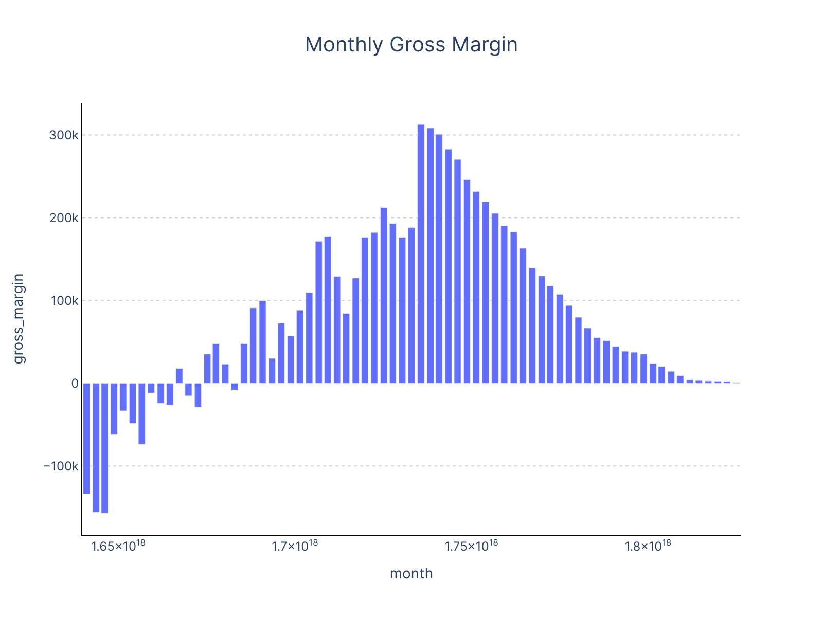 # Create the Monthly Gross Margin bar chartfig_png = px.bar(pnl_df.sort_values('month'), x='month', y='gross_margin', title='Monthly Gross Margin')# Apply Blue Theme stylingfig_png.update_layout( font=dict(family='Inter, Arial, Sans-Serif'), title=dict(font=dict(size=20), x=0.5), plot_bgcolor='white', paper_bgcolor='white', xaxis=dict(showgrid=False, showline=True, linecolor='black'), yaxis=dict(showgrid=True, griddash='dot', gridcolor='lightgray', showline=True, linecolor='black'))# Convert to PNG and displaypng_bytes = pio.to_image(fig_png, format='png', width=800, height=600, scale=2)display(Image(data=png_bytes))print('Monthly Gross Margin bar chart rendered successfully')print('')print('Key code components for this visualization:')print('1. Calculate gross_margin = revenue - costs')print('2. Use px.bar() with month on x-axis, gross_margin on y-axis')print('3. Sort data by month for proper chronological display')print('4. Apply Julius Business Theme with Inter font and clean styling')print('5. Export as high-resolution PNG (800x600, scale=2)')# Show a sample of the data being plottedprint('')print('Sample of gross margin data:')print(pnl_df[['month', 'revenue', 'costs', 'gross_margin']].head())